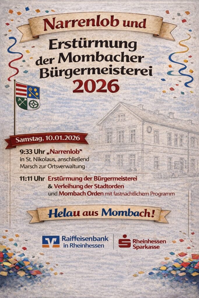 10.01.2026: Das alljährliche Narrenlob mit anschließender Erstürmung der Bürgermeisterei in Mainz-Mombach findet unter Beteiligung des Mombacher Underground Carneval Clubs statt.