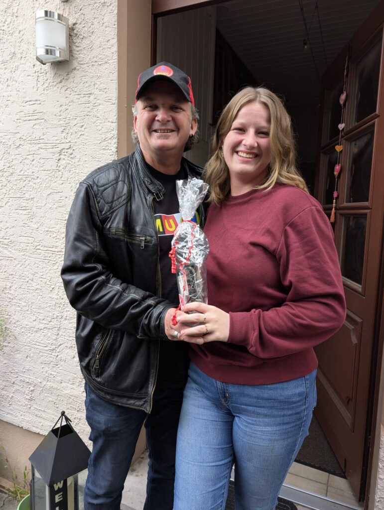Sa. 27.09.2025: Geschenk-Übergabe in Mombach unseres neuen MUCC-Schobbeglases und eines MUCC-Filz-Untersetzers, (für „runde“ Geburtstage), durch unseren OBBER-MUCC Jörg Dietrich an unser Gründungs-Mitglied Jule Hefner zum 20. Geburtstag