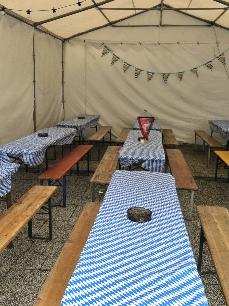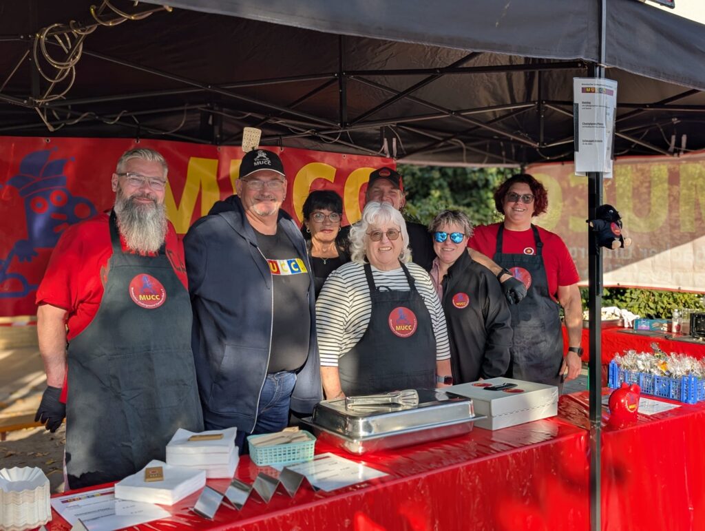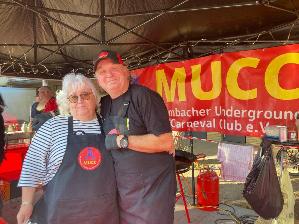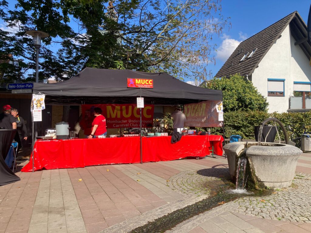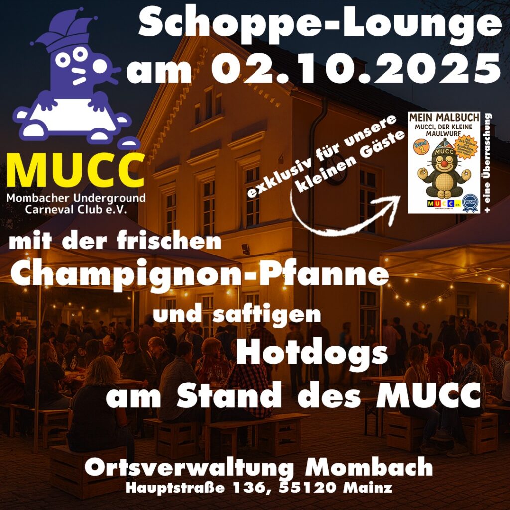 Do. 02.10.2025: Mombacher „Schoppe-Lounge“ an der mombacher Ortsverwaltung, diesmal mit Essens-Stand des MUCC e.V. mit Champignon-Panne, Hotdogs und Schnuggel-Dutscher. Außerdem gab’s für unsere kleinen ein „MUCCI-Malbuch“ und eine kleine Überraschung: