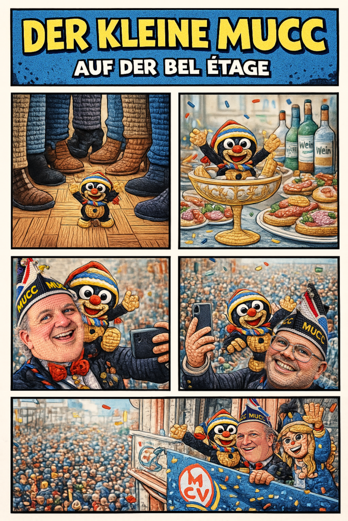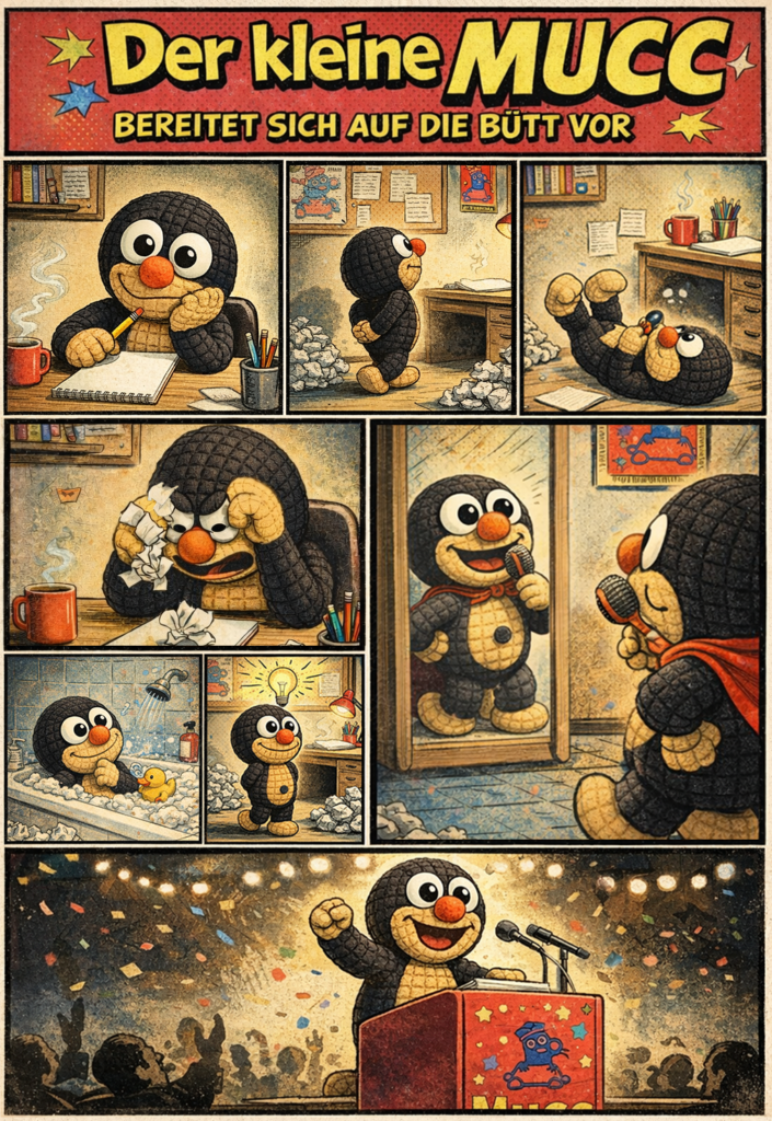 Ausgabe #13: Der kleine Mucc sitzt voller Tatendrang an seinem Schreibtisch und möchte eine Büttenrede schreiben. Die grundsätzliche Idee ist da, aber er findet einfach nicht die richtigen Worte. Schon bald verwandelt sich die kreative Euphorie in Frust: Die Reime klingen holprig, die Pointen zünden nicht, und der Stapel zerknüllter Zettel wächst schneller als seine Zuversicht. Er fragt sich, ob er sich nicht doch lieber einer Tanzgruppe hätte anschließen sollen.