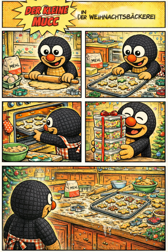 Mucci schwingt den Nudelholz‑Taktstock und backt Plätzchen für all seine Freunde. Mit Mehl im Fell, Teig an den Ohren und einer Küche, die aussieht wie ein Schneesturm aus Zucker – Mucci gibt wirklich alles für die Weihnachtsfreude.