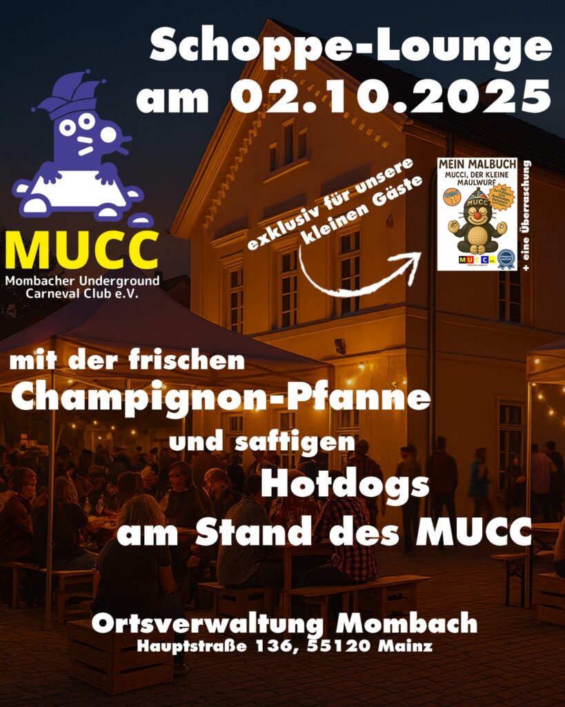 Do. 02.10.2025: Mombacher „Schoppe-Lounge“ an der mombacher Ortsverwaltung, diesmal mit Essens-Stand des MUCC e.V. mit Champignon-Panne, Hotdogs und Schnuggel-Dutscher. Außerdem gibts für unsere kleinen ein „MUCCI-Malbuch“ und eine kleine Überraschung!